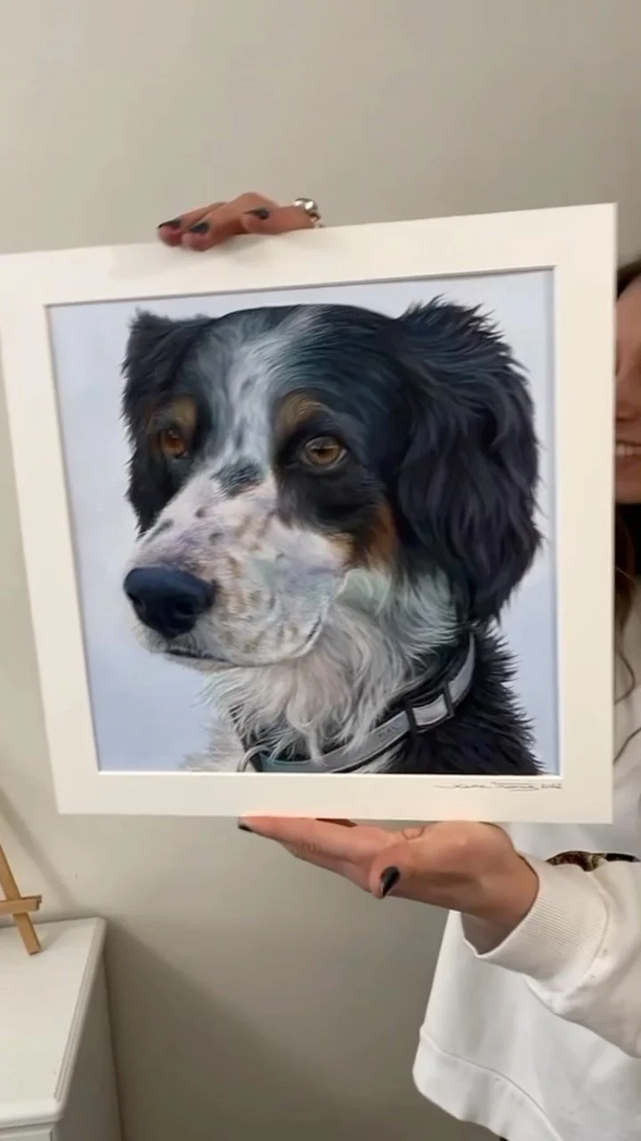My name is Katie Thomas - an award-winning UK artist specialising in custom pet portraits of dogs, cats, horses and more! I create detailed, hand-painted acrylic portraits designed to capture the unique character of your pet.